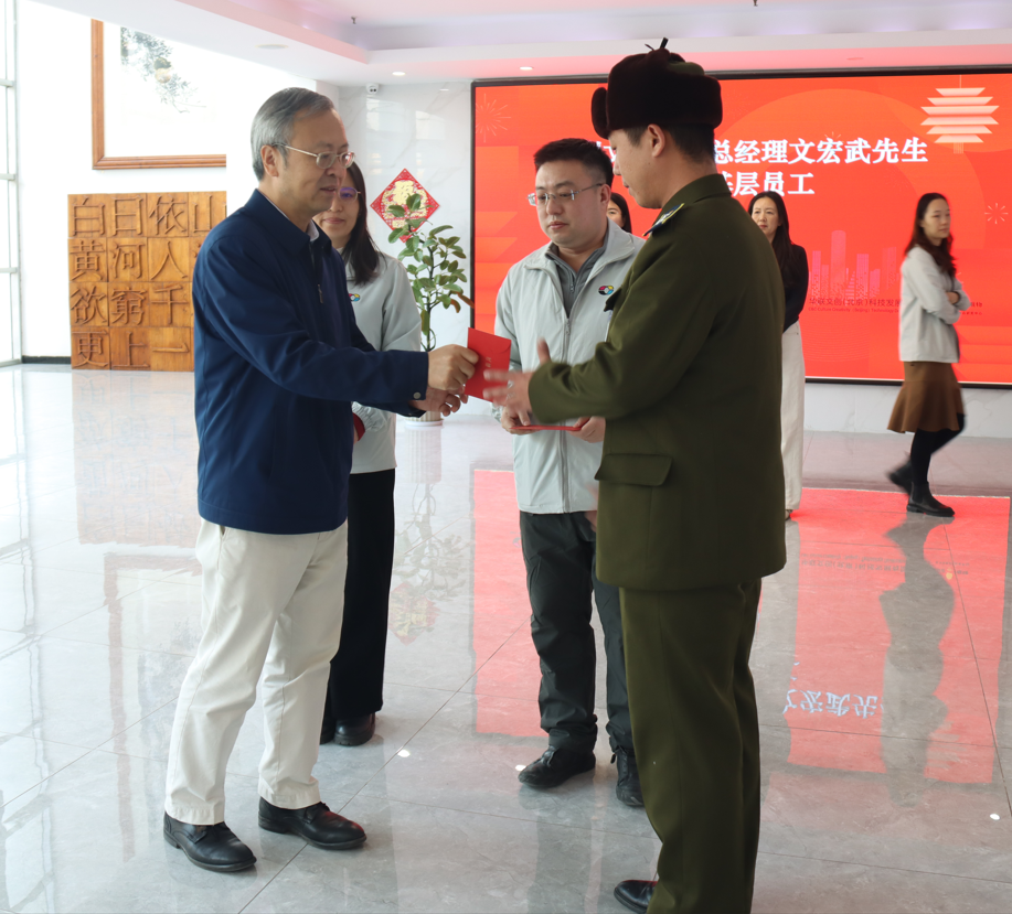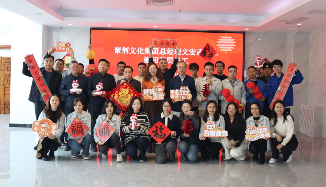 在慰问现场,文总首先向全体员工表达了诚挚的感谢。他指出,2024年在市场大环境的影响下,企业经营十分不易,但北京基地这支特别能战斗的队伍,取得了较好的业绩,值得充分肯定。紫荆文化集团对北京基地的发展高度重视,随着紫荆文化广场正式运营,北京基地的两个园区需要协同协作、相互支持。同时,永清项目将进入实质性进展阶段,北京基地的功能将更加齐全、设备更加先进,整体实力和规模将更加强大。文总希望全体员工继续发挥智慧和才能,为公司的发展贡献力量。在新春佳节即将到来之际,文总向大家送上新春的祝福,祝愿大家新春快乐、吉祥如意、心想事成、阖家幸福!