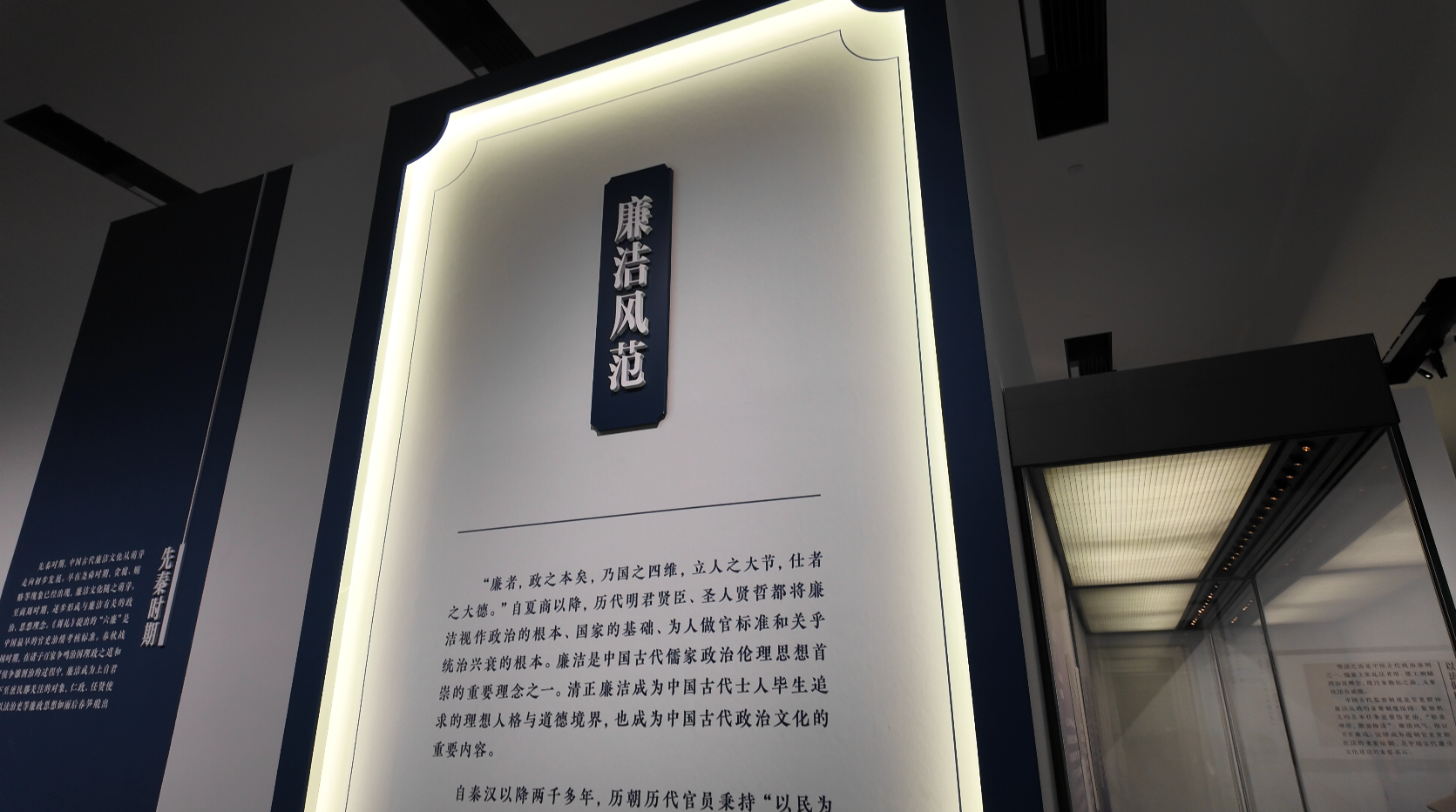 入口处的唐代《伏羲女娲像》与战国黑陶鉴、秦代量权等文物相互映衬,直观展现古人对规则秩序的追求,生动呈现廉洁文化萌芽的历史脉络。
